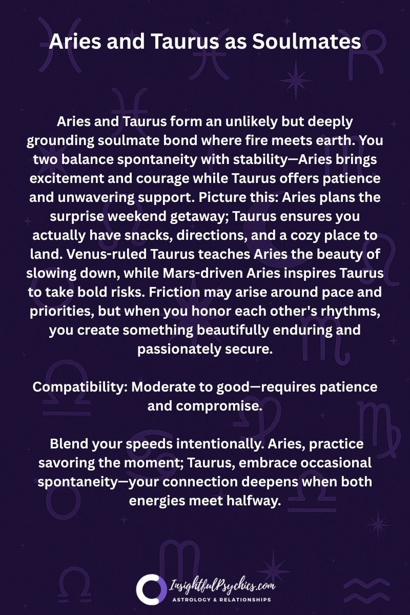 Aries and Taurus mix fire’s energy with earth’s steadiness. This brings challenges and chances for growth. Their relationship requires understanding and compromise, but can become incredibly strong.